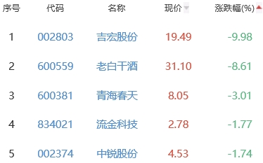 吉宏股份、老白干酒、青海春天、流金科技、中锐股份位列涨幅榜后五位,涨幅分别为-9.98%、-8.61%、-3.01%、-1.77%、-1.74%。