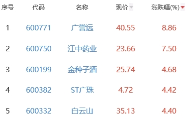 其中,广誉远、江中药业、金种子酒、ST广珠、白云山位列板块涨幅前五位,涨幅分别为8.86%、7.50%、4.68%、4.42%、4.40%。