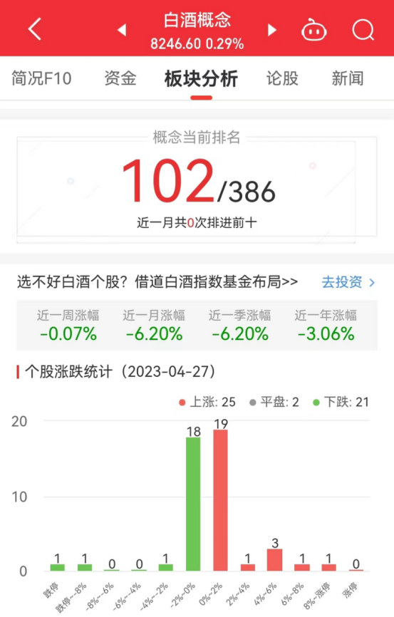 中国经济网北京4月27日讯今日,白酒概念板块整体涨幅0.29%,其中25只股票上涨,2只股票平盘,21只股票下跌。