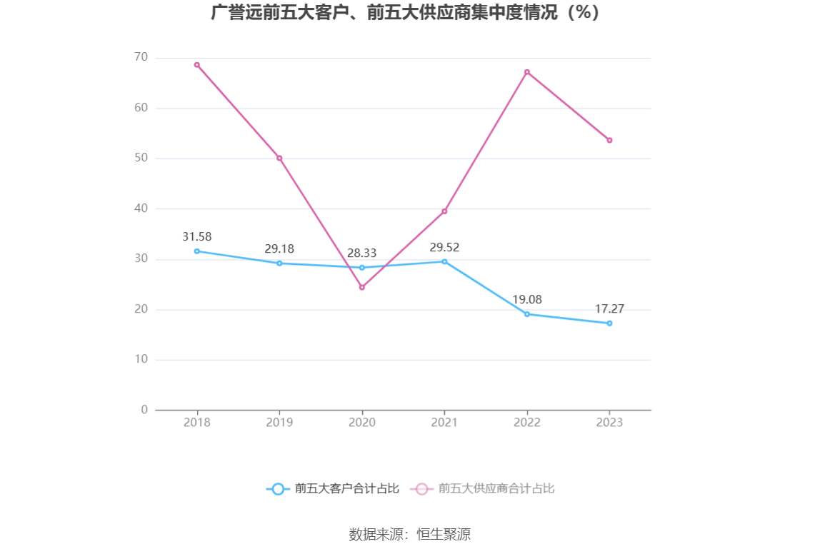 报告期内,公司前五大客户合计销售金额2.22亿元,占总销售金额比例为17.27%,公司前五名供应商合计采购金额2.71亿元,占年度采购总额比例为53.63%。