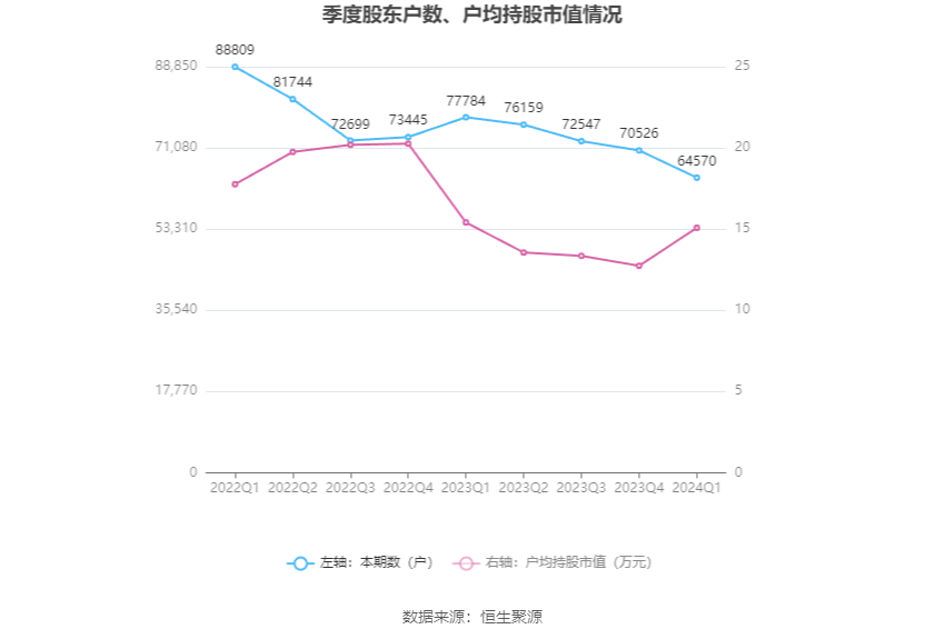 筹码集中度方面,截至2024年一季度末,公司股东总户数为6.46万户,较上年末下降了5956户,降幅8.45%;户均持股市值由上年末的12.74万元上升至15.08万元,增幅为18.37%。