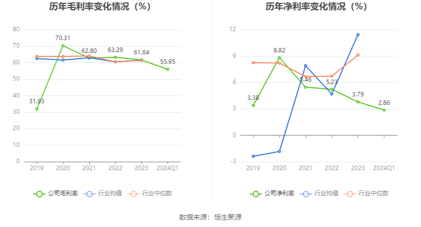 2024年第一季度,公司毛利率为55.95%,同比下降2.99个百分点;净利率为2.86%,较上年同期下降2.56个百分点。