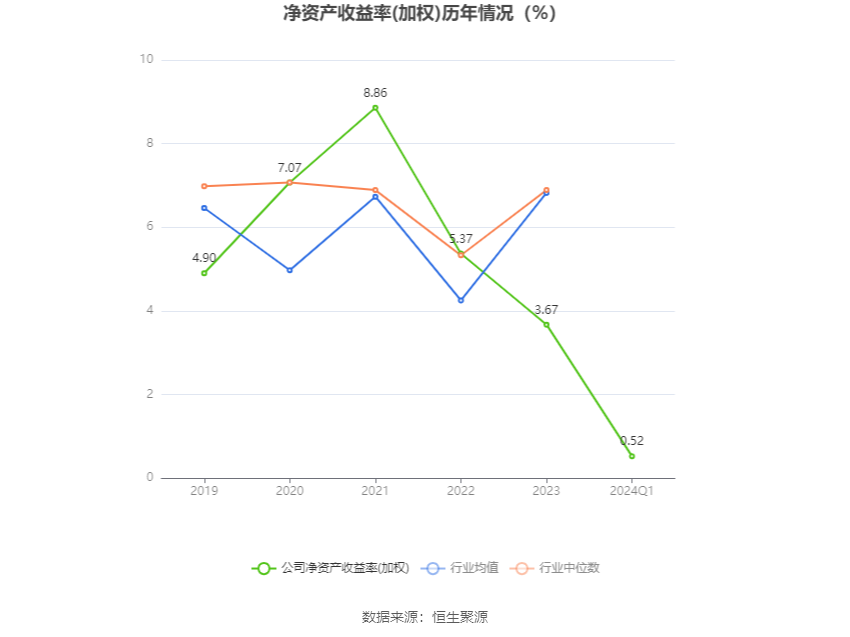 数据显示,2024年第一季度公司加权平均净资产收益率为0.52%,较上年同期下降0.93个百分点;公司2024年第一季度投入资本回报率为0.56%,较上年同期下降0.42个百分点。