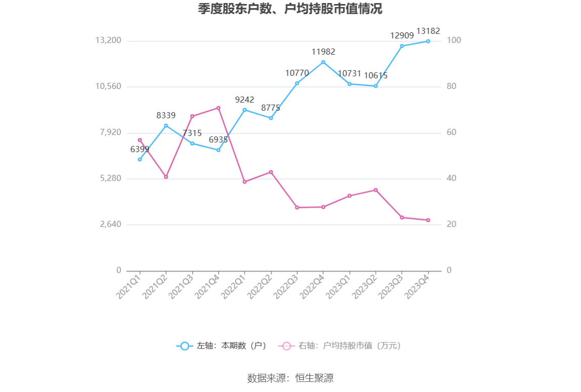 筹码集中度方面,截至2023年年末,公司股东总户数为1.32万户,较三季度末增长了273户,增幅2.11%;户均持股市值由三季度末的23.24万元下降至22.07万元,降幅为5.03%。