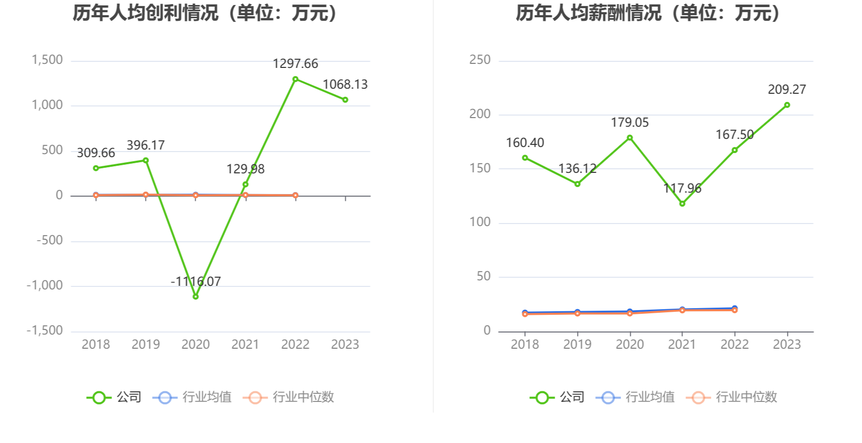 截至2023年末,公司员工总数为243人,人均创收3641.47万元,人均创利1068.13万元,人均薪酬209.27万元,较上年同期分别变化-6.21%、-17.69%、24.94%。