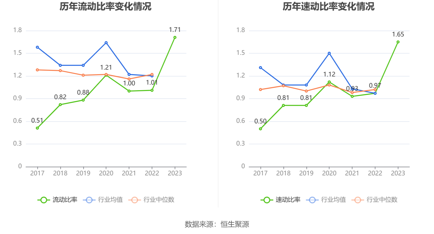 2023年,公司流动比率为1.71,速动比率为1.65。