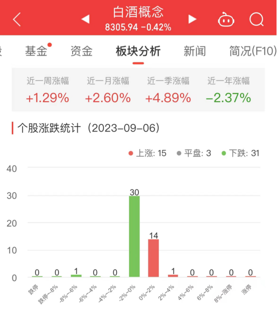 中国经济网北京9月6日讯今日,白酒概念板块整体跌幅0.42%,其中15只股票上涨,3只股票平盘,31只股票下跌。