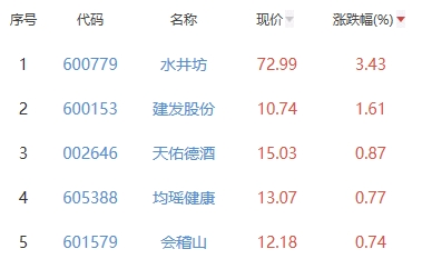 其中,水井坊、建发股份、天佑德酒、均瑶健康、会稽山位列板块涨幅前五位,涨幅分别为3.43%、1.61%、0.87%、0.77%、0.74%。