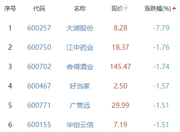 大湖股份、江中药业、舍得酒业(维权)、好当家、广誉远、华创云信位列涨幅榜后五位,涨幅分别为-7.79%、-1.76%、-1.74%、-1.57%、-1.51%、-1.51%。