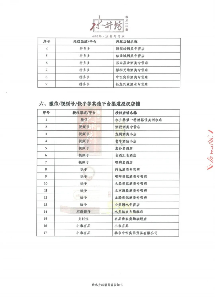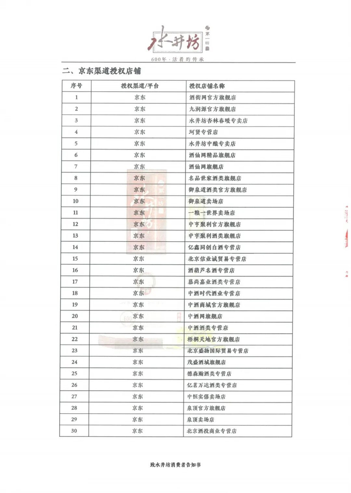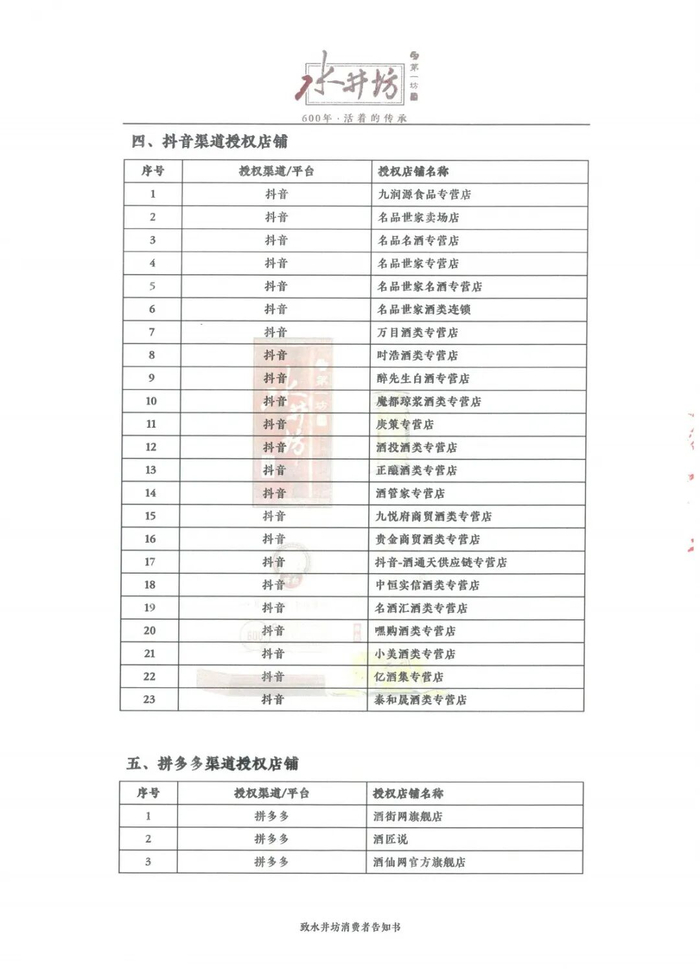 酒业家注意到,水井坊对123家官方授权店铺信息进行了公示(详见附件),包括12家自营渠道及店铺、37家京东渠道授权店铺、16家淘宝天猫渠道授权店铺、23家抖音渠道授权店铺、9家拼多多渠道授权店铺、17家微信/视频号/快手等其他平台渠道授权店铺、9家即时零售授权平台。此次公布的官方授权店铺授权有效期截至2025年12月31日,后续如有变更,水井坊将通过官方渠道及时发布。