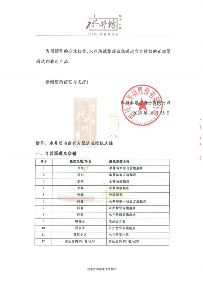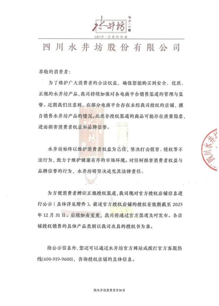 10月23日,水井坊发布《致水井坊消费者的告知书》称:近期,我们注意到,在部分电商平台存在未经我司授权的店铺,擅自销售水井坊产品的情况。此类非授权渠道的商品可能存在质量隐患,进而损害消费者权益和品牌信誉。