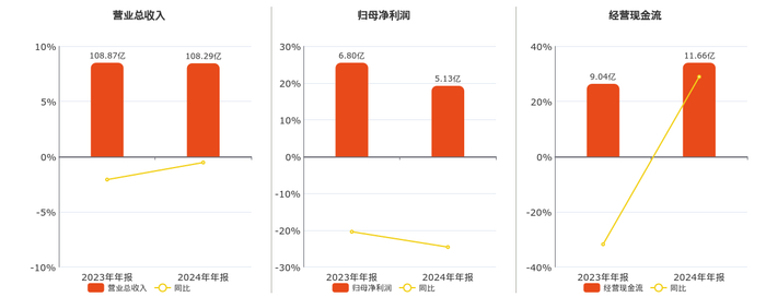 公司营业总收入为108.29亿元,在已披露的同业公司中排名第23,较去年同报告期营业总收入减少5807.48万元,同比较去年同期下降0.53%。归母净利润为5.13亿元,在已披露的同业公司中排名第32,较去年同报告期归母净利润减少1.67亿元,同比较去年同期下降24.58%。经营活动现金净流入为11.66亿元,在已披露的同业公司中排名第37,较去年同报告期经营活动现金净流入增加2.62亿元,同比较去年同期上涨28.94%。
