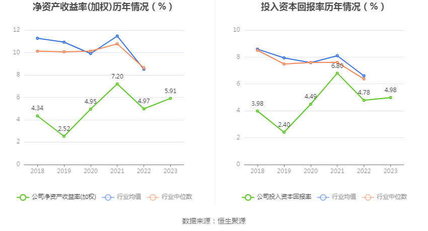 数据显示,2023年公司加权平均净资产收益率为5.91%,较上年同期增长0.94个百分点;公司2023年投入资本回报率为4.98%,较上年同期增长0.20个百分点。