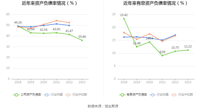 在偿债能力方面,公司2023年年末资产负债率为35.96%,相比上年末下降5.51个百分点;有息资产负债率为11.22%,相比上年末上升0.47个百分点。
