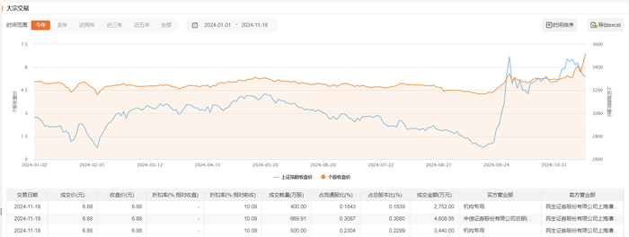 今日大宗交易成交1569.91万股,成交额1.08亿元,占当日总成交额的33.93%,成交价6.88元,较市场收盘价持平。