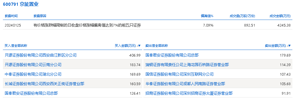 龙虎榜丨京能置业今日涨停,营业部席位合计净买入448.31万元