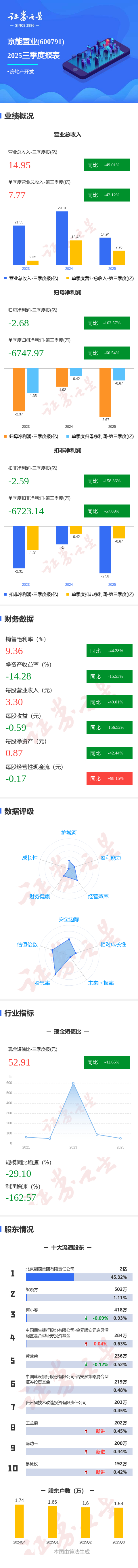 图解京能置业三季报:第三季度单季净利润同比下降60.55%