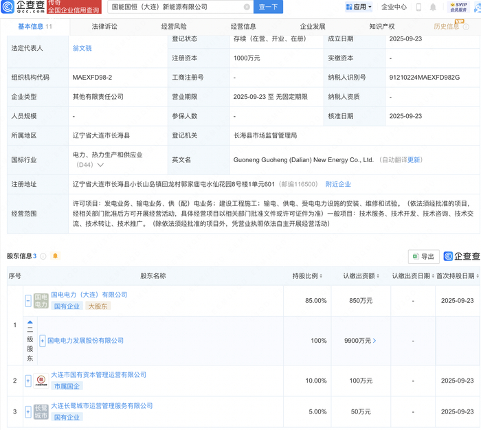 企查查APP显示,近日,国能国恒(大连)新能源有限公司成立,注册资本1000万元,经营范围包含:建设工程施工;输电、供电、受电电力设施的安装、维修和试验等。企查查股权穿透显示,该公司由国电电力(600795)全资子公司国电电力(大连)有限公司等共同持股。