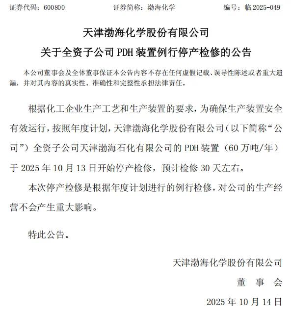 10月13日,渤海化学(600800)公告,公司全资子公司天津渤海石化有限公司的PDH装置(60万吨/年)根据年度计划,于2025年10月13日开始停产检修,预计检修30天左右。本次停产检修是例行检修,旨在确保生产装置安全有效运行,对公司的生产经营不会产生重大影响。