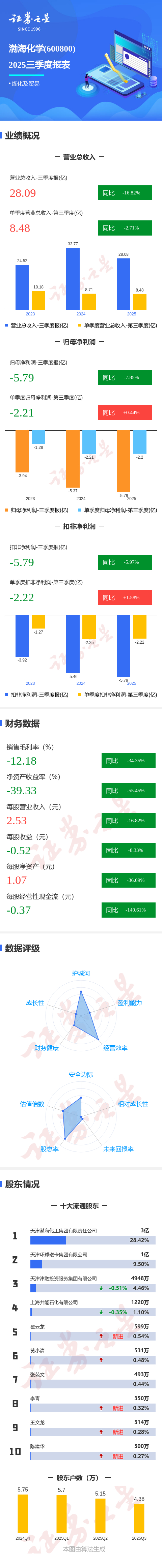 证券之星消息,渤海化学2025年三季报显示,前三季度公司主营收入28.09亿元,同比下降16.82%;归母净利润-5.79亿元,同比下降7.85%;扣非净利润-5.79亿元,同比下降5.98%;其中2025年第三季度,公司单季度主营收入8.48亿元,同比下降2.72%;单季度归母净利润-2.21亿元,同比上升0.44%;单季度扣非净利润-2.22亿元,同比上升1.59%;负债率69.82%,投资收益-206.48万元,财务费用4024.49万元,毛利率-12.18%。