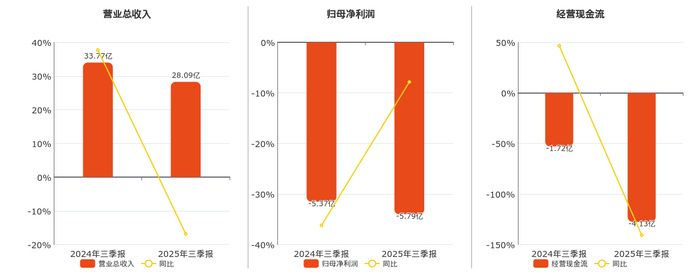 公司营业总收入为28.09亿元,在已披露的同业公司中排名第12,较去年同报告期营业总收入减少5.68亿元,同比较去年同期下降16.82%。归母净利润为-5.79亿元,在已披露的同业公司中排名第23,较去年同报告期归母净利润减少4218.30万元。经营活动现金净流入为-4.13亿元,在已披露的同业公司中排名第23,较去年同报告期经营活动现金净流入减少2.42亿元。