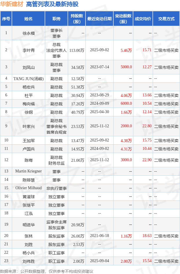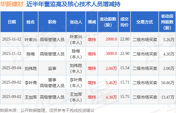 华新建材近半年内的董监高及核心技术人员增减持详情如下: