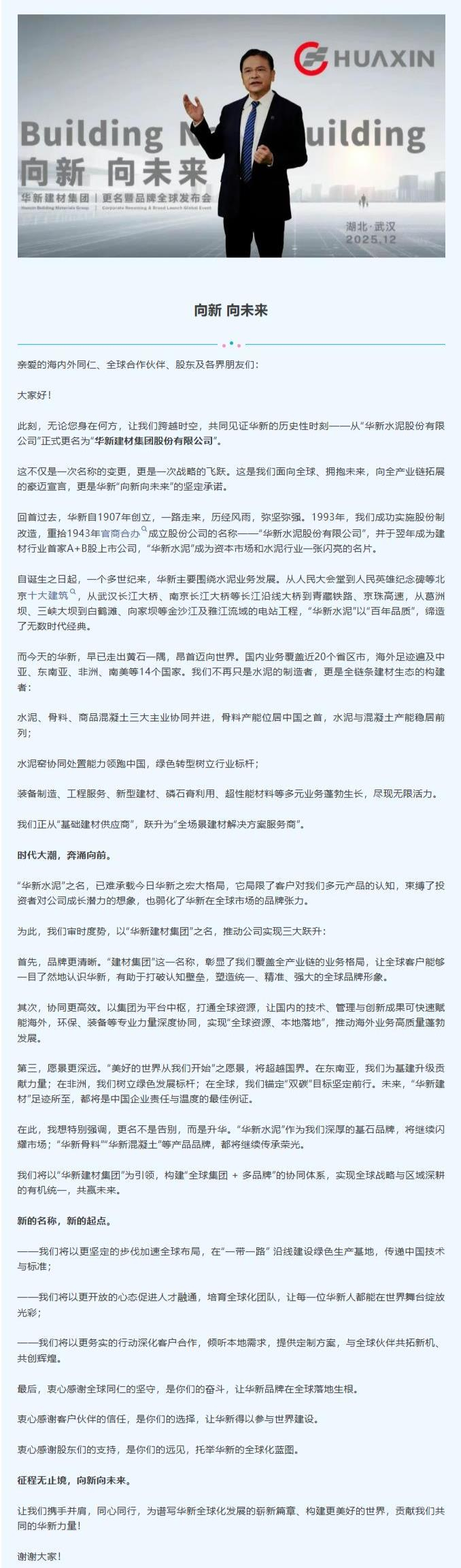 公司全体高管共同点亮华新建材集团新名称及新标识李叶青强调,更名不是告别,而是升华。未来,“华新水泥”作为华新深厚的基石品牌,将继续闪耀市场,“华新骨料”“华新混凝土”等产品品牌,都将继续传承荣光。而通过更名,将推动企业实现三大跃升:一是品牌定位更清晰,“华新建材集团”直观展现全产业链布局,助力塑造统一强大的全球品牌形象;二是资源协同更高效,以集团为平台打通全球资源,实现国内外技术、管理成果快速互通;三是发展愿景更深远,推动“美好的世界从我们开始”的企业愿景跨越国界,彰显中国企业的全球责任。
