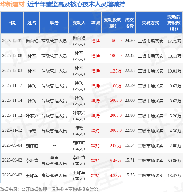 华新建材近半年内的董监高及核心技术人员增减持详情如下: