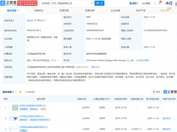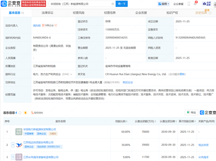 企查查APP显示,近日,华润悦电(江苏)新能源有限公司、华润悦海(江苏)新能源有限公司成立,注册资本分别为13亿元,10亿元,经营范围均包含风力发电技术服务、太阳能发电技术服务等,股东均包含华润电力新能源投资有限公司、悦达投资(600805)。