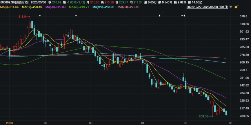 事实上,今年以来,山西汾酒股价波动下降,截至5月30日收盘价为210.69元/股,较年内高位跌幅超30%,总市值不到2600亿元。且市场对汾酒Q1业绩增速、公司局部区域库存早有担忧。