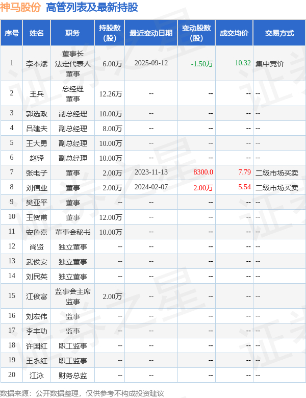 神马股份近半年内的董监高及核心技术人员增减持详情如下: