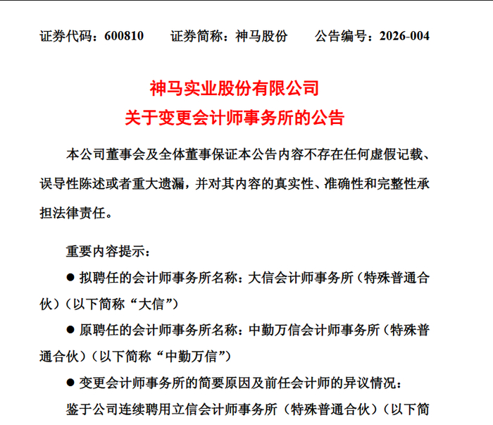 回溯此次换所的完整脉络,神马股份的审计机构更迭堪称“一波三折”。公告显示,公司原合作审计机构为立信会计师事务所,双方已连续合作满10年。2025年8月28日,神马股份董事会率先审议通过聘任中勤万信的议案,同年10月10日的股东大会进一步敲定了这一聘任决定,彼时市场普遍认为这是公司遵循审计轮换相关要求的常规操作。但仅三个月后,中勤万信便因“2025年度审计任务繁重、人员调整、其他项目时间安排变动等因素”,明确表示无法如期完成审计任务,双方最终协商一致终止合作。