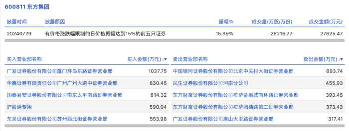 7月29日,东方集团今日涨停,龙虎榜数据显示,上榜营业部席位全天成交6260.51万元,占当日总成交金额比例为22.66%。其中,买入金额为3826.54万元,卖出金额为2433.97万元,合计净买入1392.57万元。