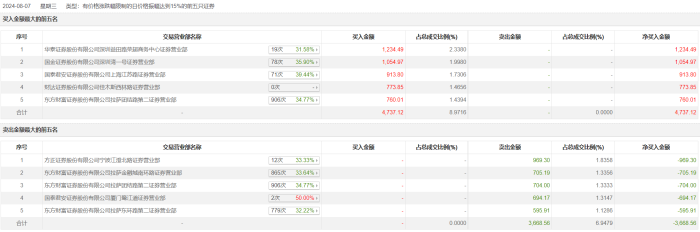 东方集团今日涨停,龙虎榜数据显示,上榜营业部席位全天成交8405.68万元,占当日总成交金额比例为15.92%。其中,买入金额为4737.12万元,卖出金额为3668.56万元,合计净买入1068.56万元。