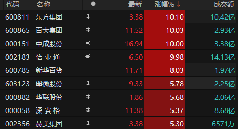 上证报中国证券网讯 10月31日上午交易时段,商贸零售板块震荡走强。截至10时38分,东方集团、百大集团、中成股份、怡亚通涨停。新华百货涨超8%,翠微股份、华联股份、深赛格等跟涨。