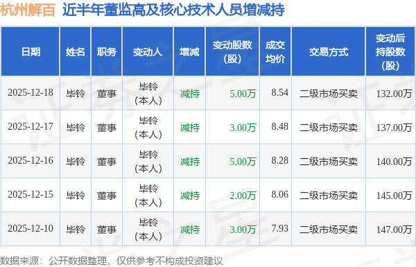 杭州解百近半年内的董监高及核心技术人员增减持详情如下:
