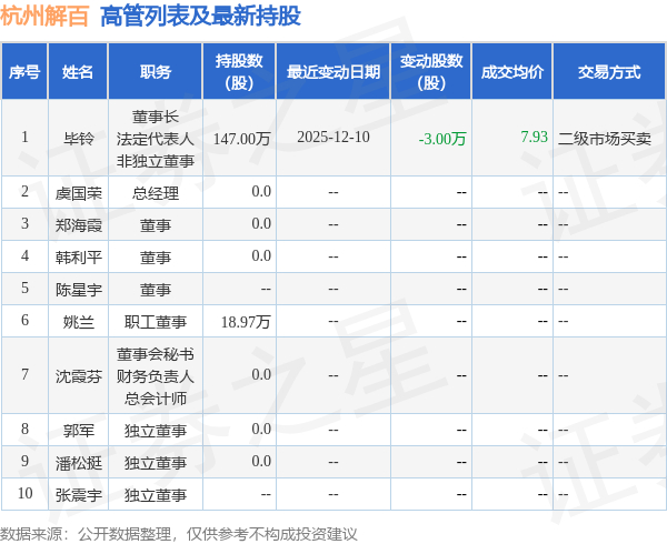 杭州解百的高管列表及最新持股情况如下: