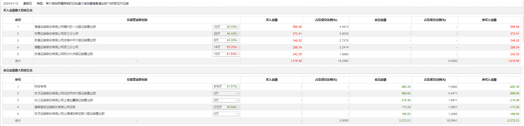 1月12日,耀皮玻璃今日涨停,全天换手率达3.05%,振幅达10.49%。龙虎榜数据显示,营业部席位合计净卖出256.73万元。其中,机构合计净卖出950.35万元。此外,海通证券福州五一北路证券营业部、东莞证券浙江分公司分别买入565.86万元、372.41万元;东方证券沈阳市府大路证券营业部、长江证券上海仙霞路证券营业部分别卖出566.60万元、215.46万元。