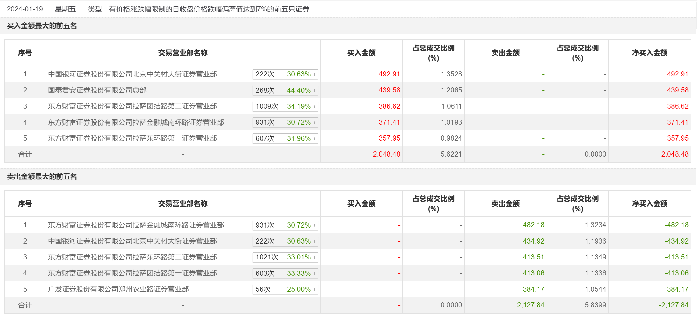 1月19日,耀皮玻璃今日跌停,全天换手率达8.79%,振幅达6.11%。龙虎榜数据显示,营业部席位合计净卖出79.36万元。其中,东方财富证券拉萨金融城南环路证券营业部、中国银河证券北京中关村大街证券营业部分别卖出482.18万元、434.92万元;中国银河证券北京中关村大街证券营业部、国泰君安证券总部分别买入492.91万元、439.58万元。