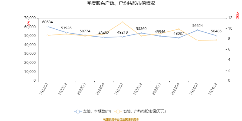 筹码集中度方面,截至2024年二季度末,公司股东总户数为5.05万户,较一季度末下降了6138户,降幅10.84%;户均持股市值由一季度末的7.73万元上升至7.81万元,增幅为1.13%。