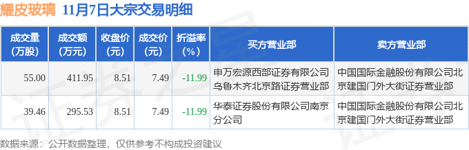 11月7日耀皮玻璃现2笔折价11.99%的大宗交易 合计成交707.48万元