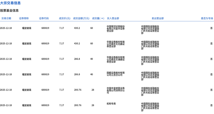 12月18日,耀皮玻璃大宗交易成交256万股,成交额1835.52万元,占当日总成交额的28.78%,成交价7.17元,较市场收盘价7.95元折价9.81%。