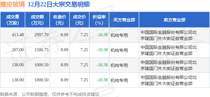 12月22日耀皮玻璃现4笔折价10.38%的大宗交易 合计成交6499.45万元