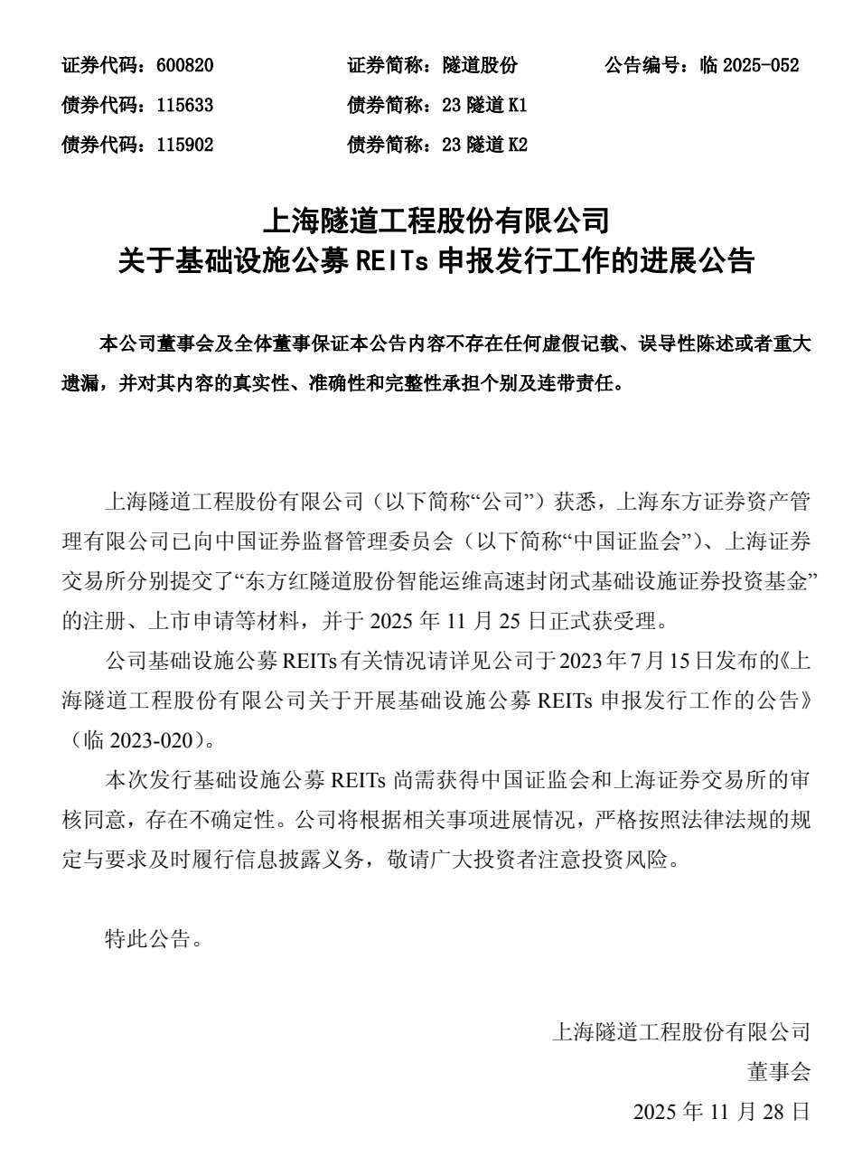 11月25日,由隧道股份作为发起人,以旗下钱江通道及接线工程过江隧道段(钱江隧道)作为底层资产的“东方红隧道股份智能运维高速封闭式基础设施证券投资基金”(钱江隧道REIT)获中国证监会、上海证券交易所受理。
