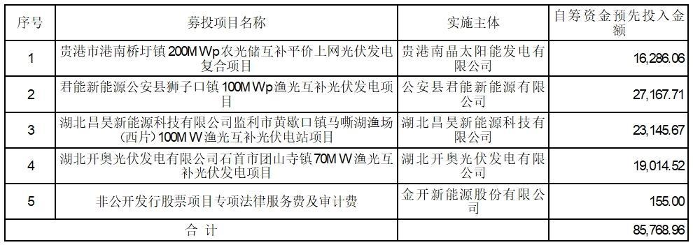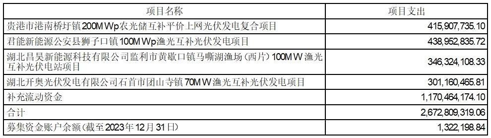 注3:《金开新能源股份有限公司2022年度非公开发行A股股票预案(修订稿)》中仅披露相关募投项目的全运营周期的内部收益率,与报告期内预计效益不具可比性,本年度实现效益是否达到预期效益的口径为参考相关项目可行性研究报告中建设期当年净利润。2023年,君能新能源公安县狮子口镇100MWp渔光互补光伏发电项目,实现全容量并网,净利润为62.46万元,其他募投项目(除补充流动资金外)实现部分分批并网,未全容量并网。