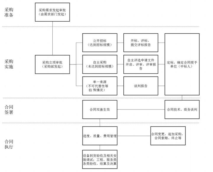 公司拥有独立的采购体系,制定了《采购管理办法》、《招标管理办法》等相关制度规范,加强对采购与付款的内部控制,采购流程的流程图如下所示: