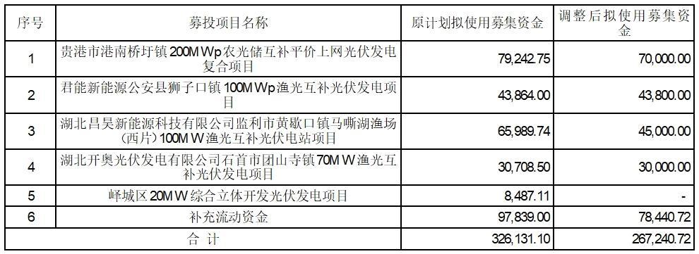 由于本次非公开发行实际募集资金净额为267,240.72万元,相比原计划有所减少,因此公司根据实际募集资金净额调整部分募投项目的拟投入募集资金金额,并拟以自筹资金建设原募投项目“峄城区20MW综合立体开发光伏发电项目”。调整后的募集资金使用计划如下: