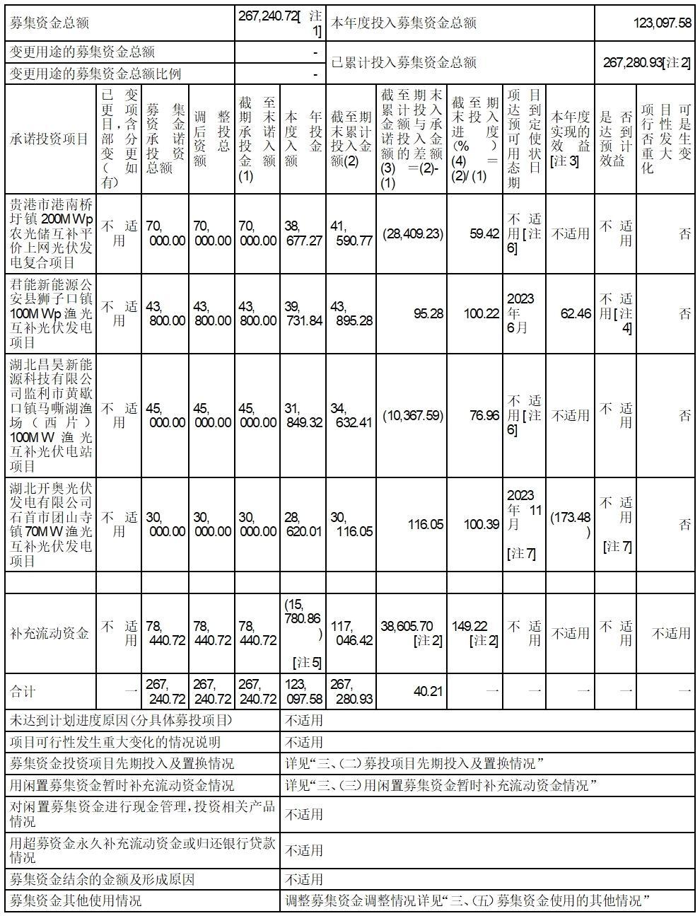 注4:君能新能源公安县狮子口镇100MWp渔光互补光伏发电项目,在2023年6月实现全容量并网,由于可行性研究报告中该项目预期效益统计口径为全年,因此本年不适用是否达到预计效益。