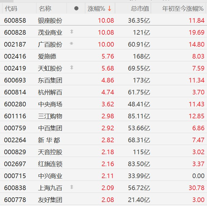 格隆汇1月9日|A股市场零售股走强,截至半日收盘,银座股份、茂业商业、广百股份10CM涨停,爱施德、天虹股份涨超5%,东百集团、杭州解百涨超4%,中央商场涨超3%。