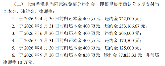 诉讼过程中,双方就债务清偿事宜进行了多次协商,最终达成调解共识。根据2026年3月2日法院出具的调解书,截至调解当日,福星集团又偿还了294.76万元,双方确认剩余欠款包括本金2850万元、截至2026年2月13日的违约金262.97万元、后续按年利率24%计算的违约金以及律师费10万元。同时,双方约定了分6期的还款计划。